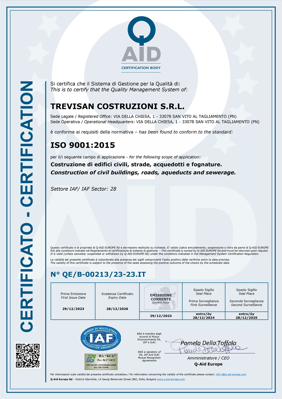 Trevisan Costruzioni lavora seguendo i principi e le linee guida della nuova norma UNI EN ISO 9001:2015 e partecipa alle gare d'appalto per lavori pubblici grazie alla qualificazione rilasciata dall'organismo certificatore Q-AID
