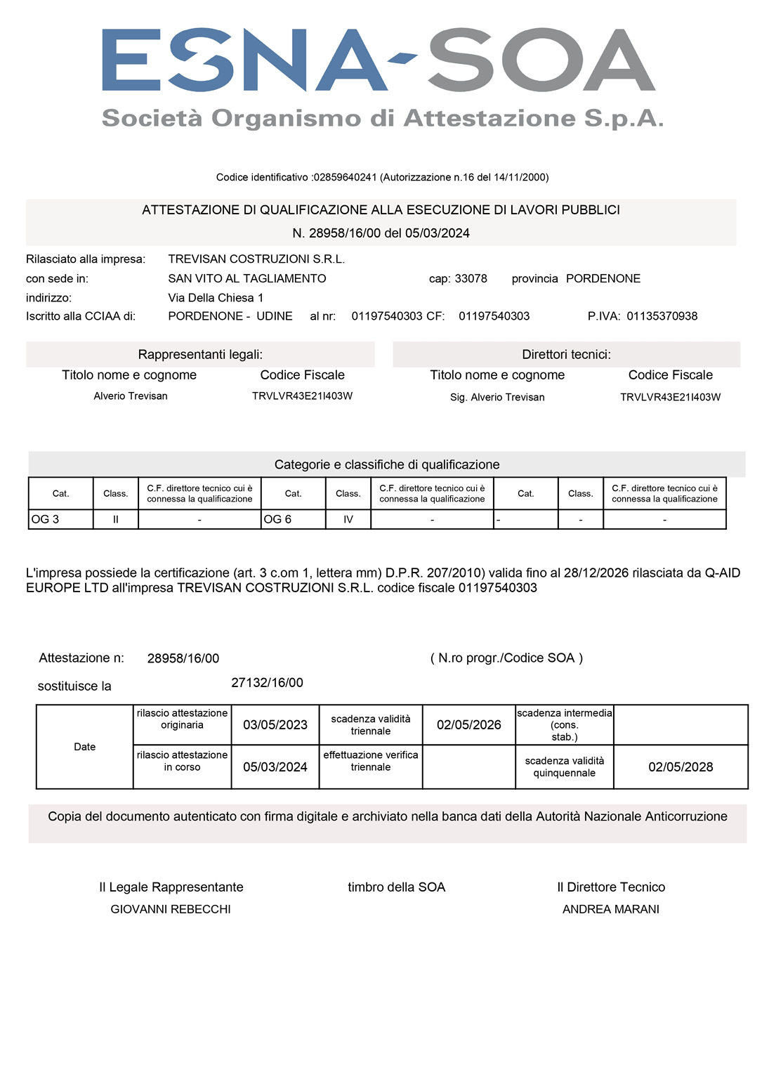 Trevisan Costruzioni opera nel settore dei lavori pubblici grazie alla consolidata certificazione Soa, rilasciata da ESNA-SOA di Padova per le seguenti categorie: